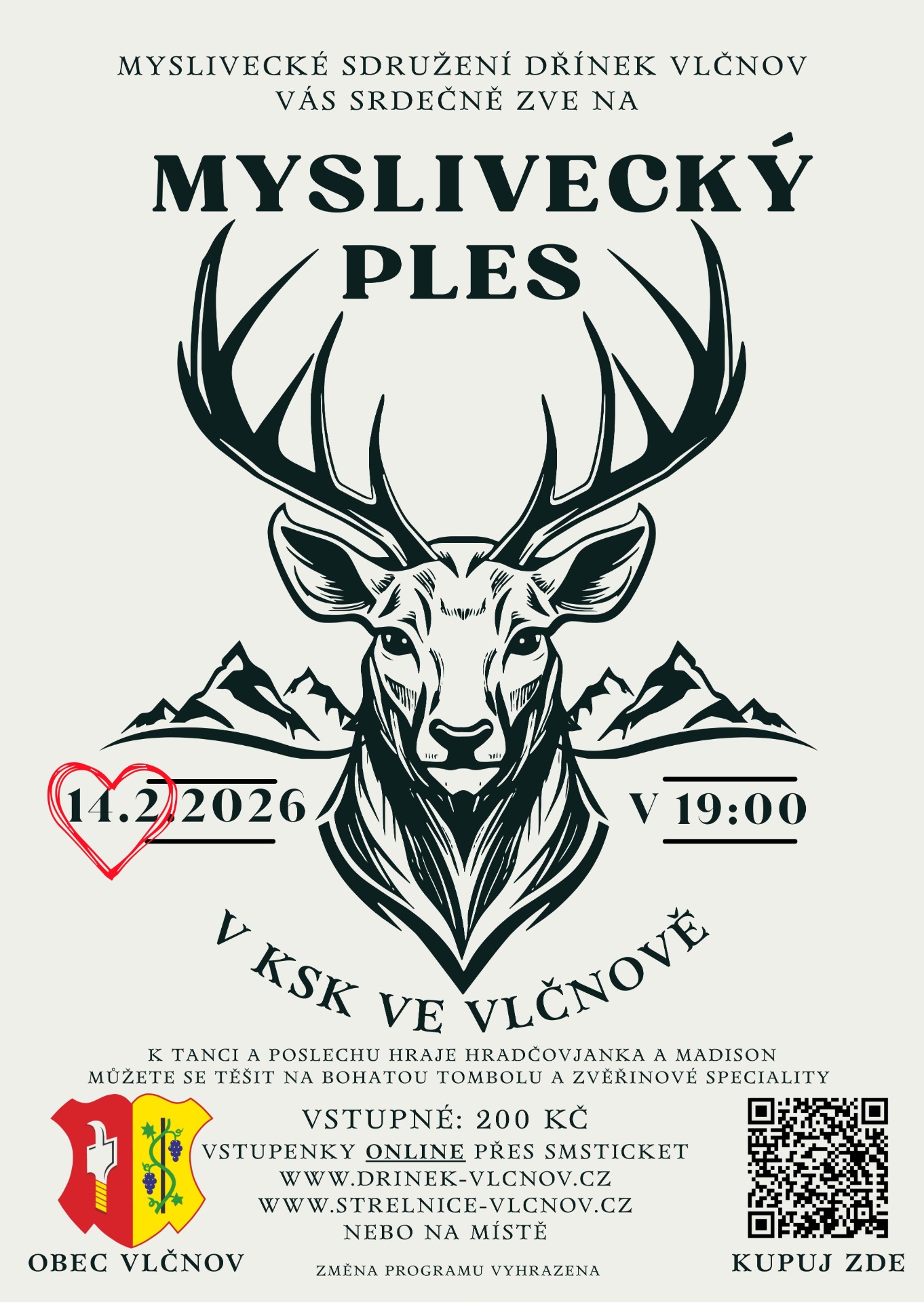 Chtěli bychom vás pozvat na Myslivecký ples, kde k tanci a poslechu bude hrát dechová hudba Hradčovjanka a rocková kapela Madison.