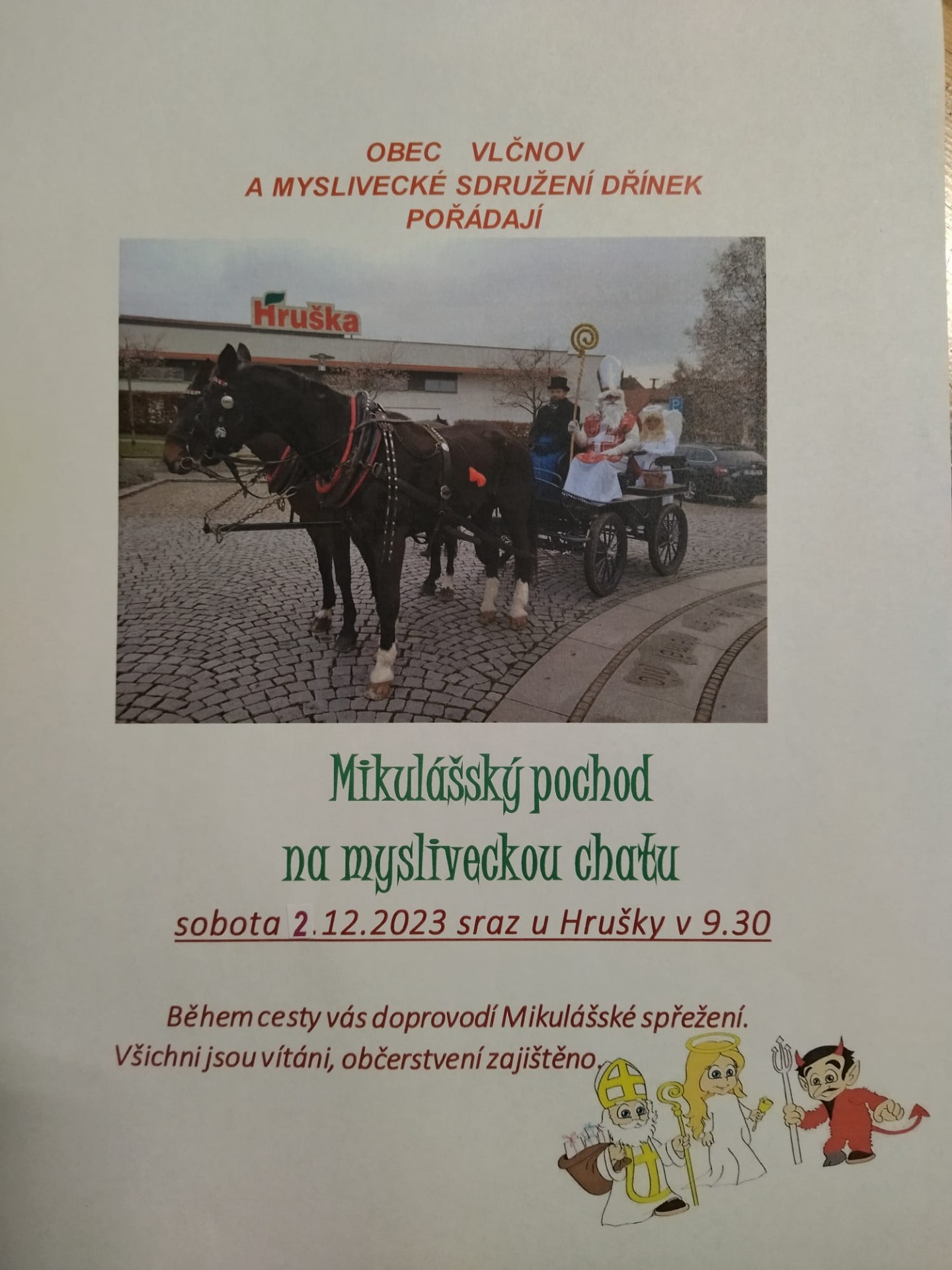 Myslivecké sdružení Dřínek Vlčnov, Římskokatolická farnost Vlčnov, Obec Vlčnov a Honební společenství Dřínek Vlčnov pořádají dne 29.10.2023 Hubertské slavnosti se Svatohubertskou mší v kostele sv. Jakuba st. Začátek v 9:30. jako doprovodný program bude vystoupení sokolníků a jako občerstvení bude zvěřinový guláš.